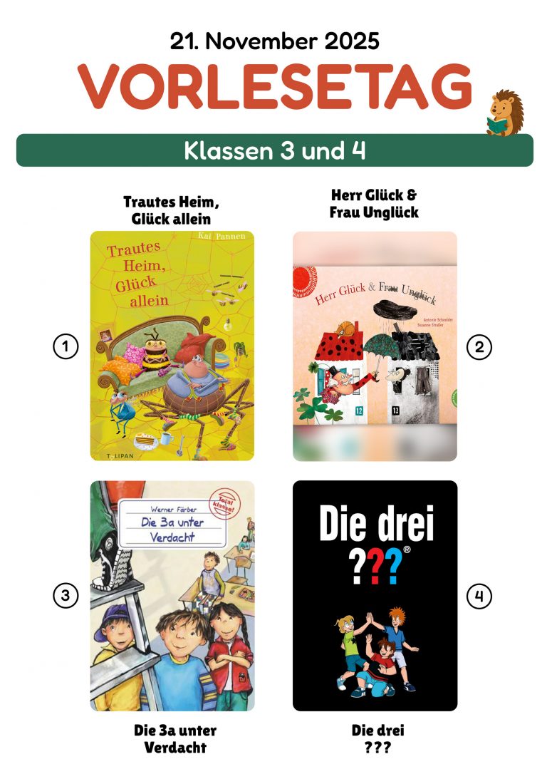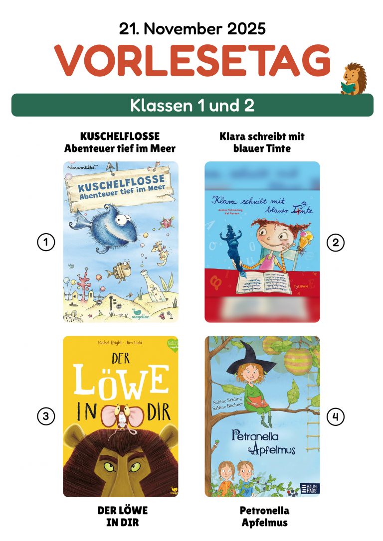 Am 21.11.2025 findet an der Meckinghover Grundschule ein Vorlesetag statt. Die Kinder dürfen in der nächsten Woche aus vier Angeboten wählen, welche zwei Bücher sie am Vorlestag hören möchten. Im Anschluss an die Geschichten haben die Lehrerinnen und Lehrer kreative Angebote zu den Büchern vorbereitet. Wir wünschen allen Kindern ganz viel Spaß!